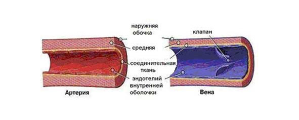 Строение стенки вены такое же, как у стенки артерии. Она состоит из трех слоев, но в ней менее выражены эластические элементы, что связано с более низким давлением и меньшей скоростью кровотока в них. В отличие от артерий в венах есть клапаны (рисунок 7), которых особенно много в венах нижних конечностей. Они препятствуют обратному току крови под действием силы тяжести.