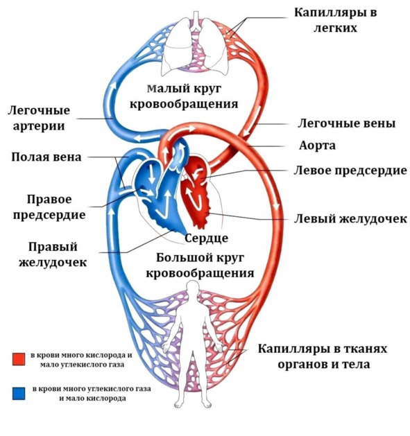 Большой круг кровообращения начинается в левом желудочке, из которого выходит аорта, и заканчивается в правом предсердии, впадением верхней и нижней полых вен. Кровь в аорте артериальная, обогащенная кислородом, и по артериям поступает к различным органам и тканям. Пройдя через органы, из крови кислород переходит в ткани, а углекислый газ (двуокись углерода) – в кровь, и по нижним полым венам поступает в правое предсердие, из которого – в правый желудочек.