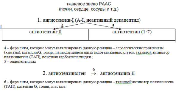 Тканевое звено ренин-ангиотензин-альдостероновой системы (РААС). В последние годы установлено, что помимо компонентов РААС, циркулирующих в крови, образование биологически активных соединений ангиотензина-II, ангиотензина (1—7) и других происходит непосредственно в тканях (почки, сердце, сосуды и т.д.). Показано, что примерно 70—80% ангиотензина II синтезируется именно в тканях из ангиотензина I или проангиотензиногена (схема 7, 1 и 2, соответственно), как внутри, так и вне клеток.