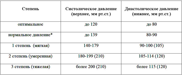 Классификация гипертензии в зависимости от показателей артериального давления (Рекомендации экспертов ВОЗ и Международного общества по гипертензии).