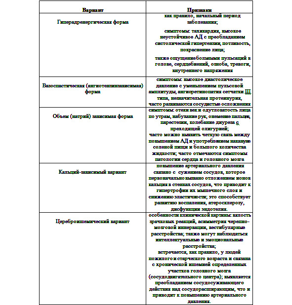 Также выделяют варианты течения артериальной гипертензии в зависимости от клинической картины и изменения ряда биохимичесих показателей.