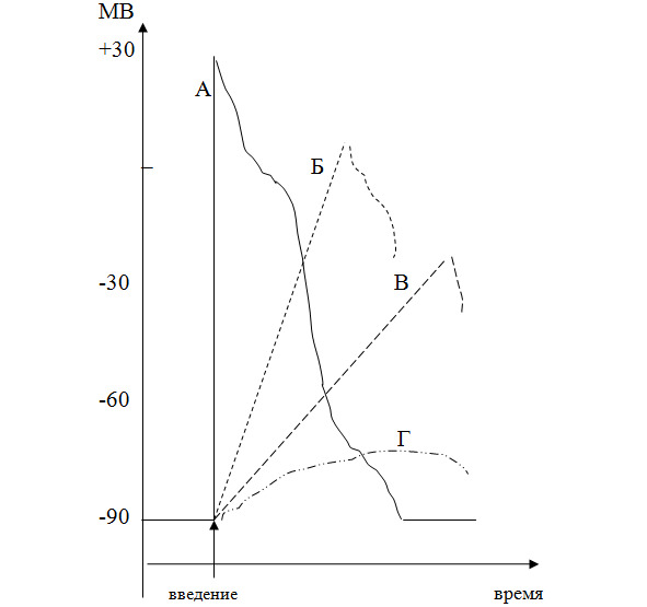А – развитие потенциала действия в норме; Б,В,Г – концентрация местного анестетика возрастает в последовательности Б <В <Г.
