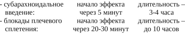 Способ и место введения. В зависимости от способа и места введения МА начало и продолжительность действия значительно варьируют. При субарахноидальном и подкожном введении эффект развивается наиболее быстро, но он непродолжительный. Самое медленное развитие анестезии и большая продолжительность отмечаются при проведении блокады плечевого сплетения. Это наглядно видно при применении бупивакаина: