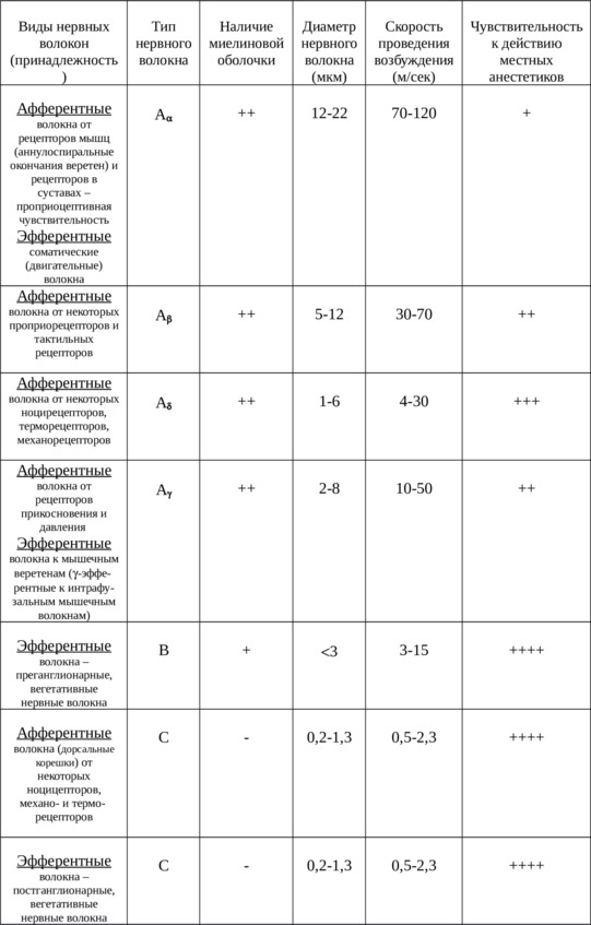 Наиболее чувствительны к действию местных анестетиков нервные волокна с маленьким диаметром без миелиновой оболочки, в которых скорость проведения импульса и длительность деполяризации большие. Этими свойствами обладают Адельта– и С-волокна, при участии которых осуществляется передача, в том числе и болевых ощущений. К Адельта-типу также относятся нервные волокна, участвующие в передаче температурной чувствительности. Преганглионарные (вегетативные) нервные волокна представлены В-типом, имеют тонкую миелиновую оболочку и скорость проведения импульса в них достаточно высокая. Нарушение проведения нервного импульса по данным нервам приводит, как правило, к развитию нежелательных побочных эффектов при применении МА. Другие виды чувствительности передаются при помощи нервных волокон, относящихся к Аβ– и Ау-типам и покрытых миелиновой оболочкой. Скорость проведения импульса и длительность деполяризации в них практически на порядок ниже, чем в волокнах Адельта – и С-типа. Поэтому тактильная и другие виды чувствительности исчезают позже болевой и температурной. Аксоны соматических нервов и проприоцептивные нервные волокна относятся к Аα-типу. Они покрыты плотной миелиновой оболочкой и скорость проведения нервного импульса в них самая низкая. МА не проникают сквозь шванновскую оболочку двигательных нервов и блокируют проведение импульса только в перехватах (узлах) Ранвье. Для прекращения проведения импульса по этим нервным волокнам необходимо распространение действия МА на три последовательно расположенных узла. При одинаковом диаметре блокада проведения импульса развивается раньше в нервных волокнах, покрытых миелиновой оболочкой, по сравнению с безмиелиновыми волокнами. С этим связано более быстрое наступление блокады в преганглионарных В-волокнах, чем в безмиелиновых С-волокнах. В таблице 3 суммированы сведения о типах нервных волокон и их чувствительности к действию местноанестезирующих средств.
