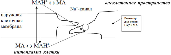 Выявлено, что МА способны взаимодействовать с рецептором как в виде неионизированной [МА], так и ионизированной [МАН+] формы. Как показано на рисунке 1, место связывания для неионизированных молекул на специфическом рецепторе расположено ближе к наружной поверхности мембраны, а для ионизированных форм – к внутренней. Чтобы осуществилось присоединение местного анестетика к месту связывания, расположенном ближе к внутреннему краю мембраны, молекула ЛС должна проникнуть внутрь клетки. Соединение поступает в клетку только в том случае, если оно находится во внеклеточной среде в неионизированном виде. В цитоплазме клеток происходит диссоциация молекулы МА с образованием катиона, который и взаимодействует с рецептором. При присоединении МА к рецептору происходят структурные изменения липопротеинов мембраны, что вызывает уменьшение диаметра и снижение проницаемости натриевого канала. Считается, что большее значение в реализации анестезирующего эффекта имеет взаимодействие с рецепторами именно ионизированной формы МА.