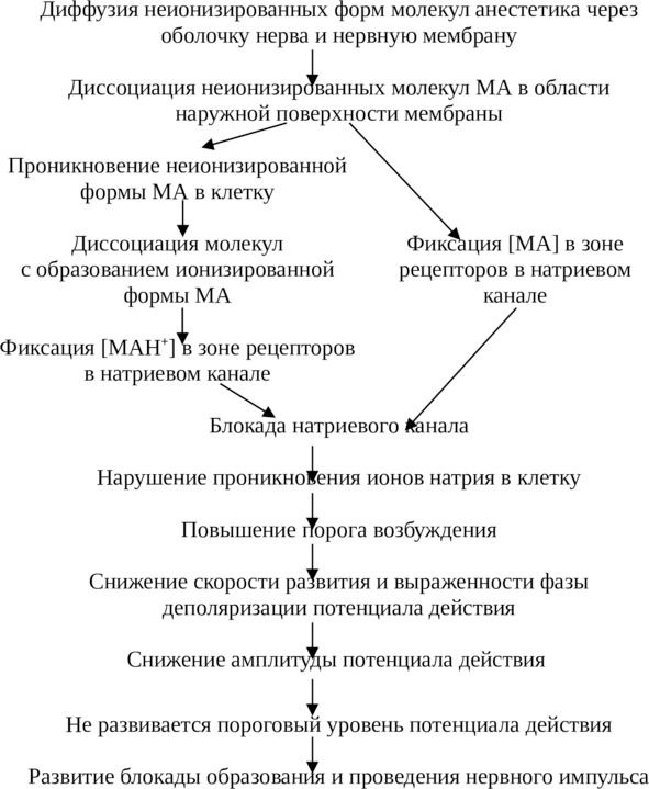 Последовательность процессов, приводящих к блокаде проведения импульса по нервному волокну под влиянием местноанестезирующего средства, представлена на схеме 1. Такая последовательность развития событий связана с увеличением количества рецепторов, заблокированных МА, то есть чем выше концентрация препарата, тем выраженность анестезирующего эффекта больше.