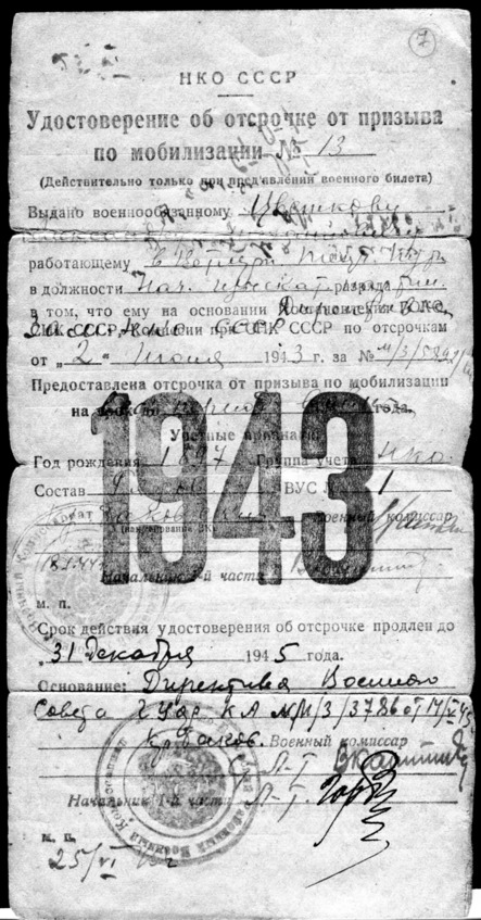 Имел «Удостоверение об отсрочке от призыва по мобилизации на весь период Великой Отечественной войны» (в обиходе – бронь) – на основании документа «Директивы Зам. НКО по отсрочкам» от 2.06.1943 года, выданное Краснобаковским комиссариатом 18.01.1944 года. Этот документ подтверждает, насколько была значима работа в годы войны на речном транспорте по обеспечению безаварийного судового хода для перевозки народнохозяйственных грузов. В 1948 году Александру Михайловичу было присвоено звание техника – лейтенанта речного флота.