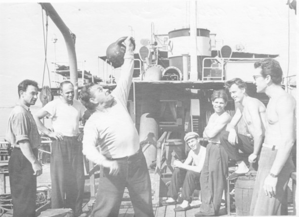 Соревнование гиревиков на судне, август 1959 года. Зименский перекат. На переднем плане Александр Михайлович Цветков, ему 62 года.