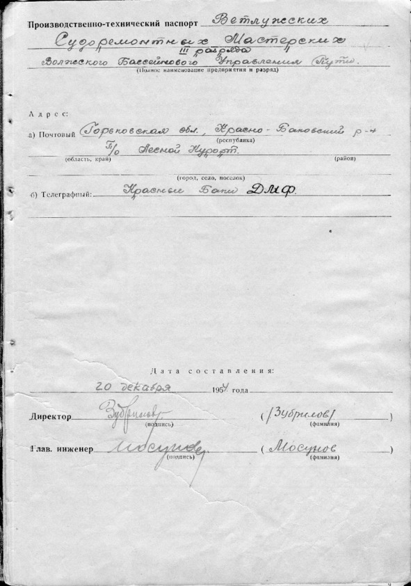 Производственно – технический паспорт предприятия Ветлужские судоремонтные мастерские Волжского бассейного управления пути от 20 декабря 1954 года