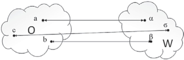 Цифровой двойник предполагается создавать из принципов изоморфизма теории множеств, включающего копию технико-технологических элементов сортировочной горки с помощью информации со всех доступных устройств и датчиков. Пусть O – множество состояний сортировочной горки, а W – множество состояний ее цифрового двойника. Под изоморфизмом понимается взаимно-однозначное отображение элементов одного множества в элементы другого множества. Подобная биекция предполагает совпадение количества элементов этих двух множеств, то есть их равномощность. Графически это представлено на рисунке 1.