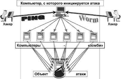 Последние годы характеризуются множеством случаев разнообразных атак на системы электронного банкинга и банковские автоматизированные системы кредитных организаций. Упоминавшаяся выше атака типа «отказ в обслуживании» изначально организовалась с помощью программ, осуществлявших генерацию очень большого количества запросов, передаваемых через вычислительные сети на сервер – объект атаки, обычно в короткие интервалы времени. Тем самым превышалась производительность сервера и он прекращал функционирование, «не в силах» справиться с таким количеством запросов[55]. В современных условиях применяется «распределенный» вариант этой атаки, осуществляемой через промежуточные сетевые компьютерные системы с целью многократного усиления негативного эффекта (повышения «мощности атаки»). Для этого могут использоваться ложные сетевые обращения (ping[56]), программы-черви (worm), распространяющиеся по вычислительным сетям и инсталлирующиеся на каждом доступном АРМ, чтобы в заданный момент времени начать генерацию ложных запросов, и пр. Это происходит в фоновых режимах, почему задействованные компьютеры иногда называются «зомби», а сеть, которая из них состоит, – «ботнет»[57]. На рисунке 2.2 показана общая схема сетевых атак рассматриваемого типа (представляющая собой модифицированный рисунок из книги Crume J. Inside Internet Security).
