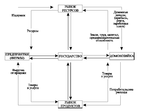 Государство взаимодействуют с фирмами и домашними хозяйствами через налоги. Домохозяйства платят государству прямые налоги (подоходный, на заработную плату, поземельный и др.), а получают от государства заработную плату, жалованье, трансфертные платежи (пенсии, стипендии, дотации на квартирную плату и т. п.). Фирмы платят государству прямые налоги (на прибыль, взносы на социальное страхование) и косвенные налоги (акциз, налог с оборота и др.), а получают от государства трансфертные платежи в форме субсидий, налоговых льгот, льготных займов, оплаты расходов бюджетных организаций и др.