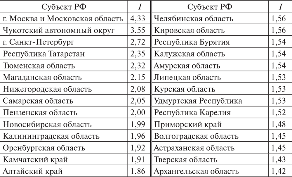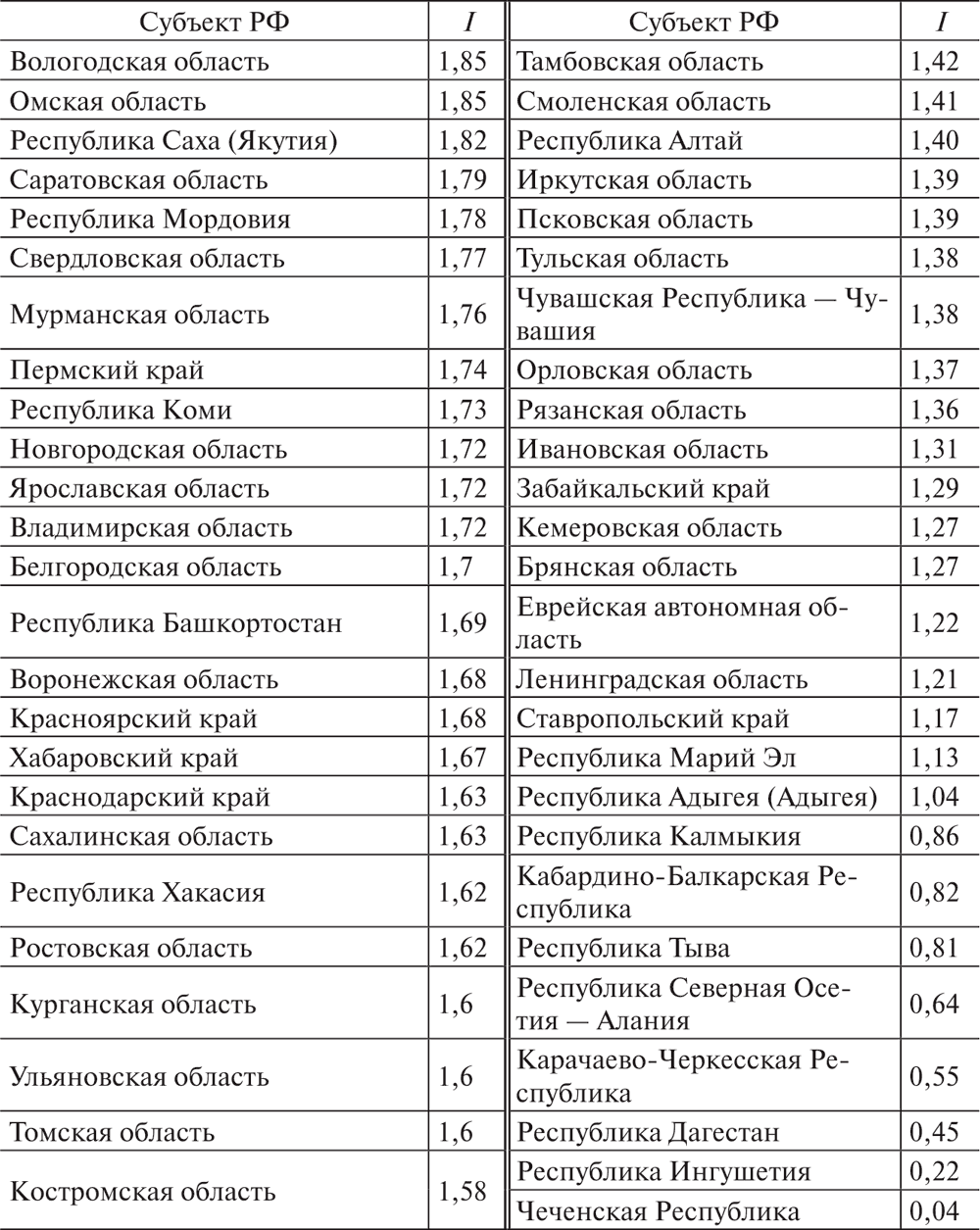Таблица 1.5 Коэффициент адекватности финансовой инфраструктуры потребностям информационного общества российских регионов
