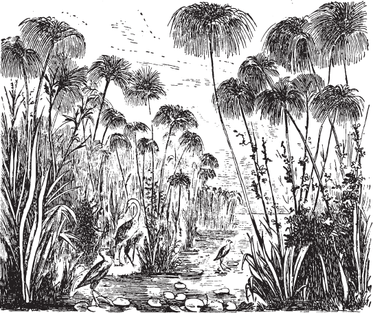 На берегах Нила и его рукавов в дельте росли водяные растения – лотос и папирус. Папирус – очень полезное растение. Это тростник, из толстых стеблей которого делали лёгкие челноки, из тонких – плели корзины, вили верёвки; корни его шли на топливо, а молодые побеги употреблялись в пищу.
