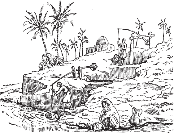 От озёр и Нила были проведены оросительные каналы к полям и садам. На высокие поля, куда вода не могла дойти по каналам, она подавалась посредством «журавлей», или, как их теперь называют в Египте, шадуфов. Производилось это следующим образом: по высокому берегу канала делались один над другим 2–3 уступа. Над каналом, на каждом уступе, укреплялись горизонтально длинные жерди. На один конец жерди вешали кожаное ведро, на другой – большой ком глины или камень в качестве противовеса. Этим ведром черпали из канала воду и подавали с уступа на уступ, пока она не доходила до поля. В жаркое время года воду приходилось черпать с утра до вечера каждый день.