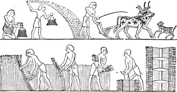 Полевые работы в древнем Египте. Вверху – сев, внизу – жатва