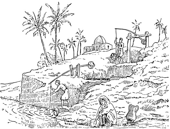 От озёр и Нила были проведены оросительные каналы к полям и садам. На высокие поля, куда вода не могла дойти по каналам, она подавалась посредством журавлей, или, как их теперь называют в Египте, шадуфов. Производилось это следующим образом: по высокому берегу канала делались один над другим 2–3 уступа. Над каналом на каждом уступе укреплялись длинные жерди. На один конец жерди вешали кожаное ведро, на другой – большой ком глины или камень в качестве противовеса. Этим ведром черпали из канала воду и подавали с уступа на уступ, пока она не доходила до поля. В жаркое время года воду приходилось черпать с утра до вечера каждый день.