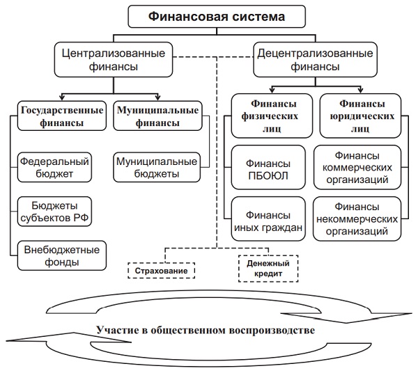 Таким образом, как видно из приведенной схемы, финансовая система страны образуется из централизованных и децентрализованных финансов, участвующих в общественном воспроизводстве, которые включают в себя государственные, муниципальные финансы и финансы юридических и физических лиц. Последние, в свою очередь, подразделяются на финансы федеральных, муниципальных бюджетов, бюджетов субъектов РФ и внебюджетные фонды; финансы предпринимателей и иных граждан, финансы коммерческих и некоммерческих организаций. Такие составляющие финансовой системы, как «страхование» и «денежное кредитование», относятся к различным подсистемам, однако в силу их правовой и экономической значимости мы выделили их в относительно обособленные элементы в составе финансовой системы.