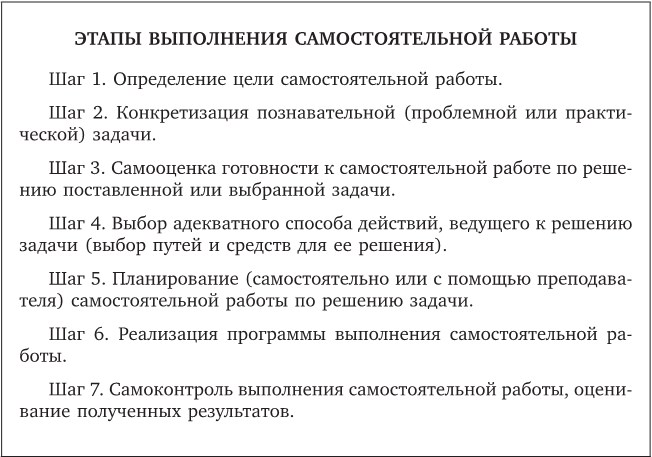 Выполнение любого вида самостоятельной работы предполагает прохождение учеником следующих этапов.