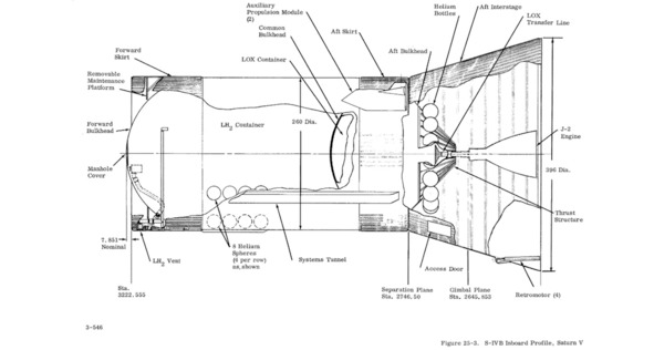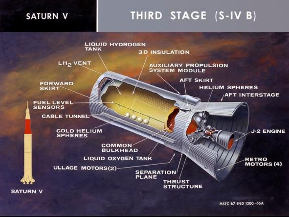 Указатели со словами «RINGS» (Кольца) показывают соприкосновение огромного бака с внутренними стенками цилиндра ступени. По всей видимости, это места крепления бака, перегороженного на две части с жидким водородом и жидким кислородом, если верить сказкам НАСА. Схема второй ступени ракеты «Сатурн-1Б» совпадает с о схемой ступени ракеты третьей ступени ракеты «Сатурн-5» S-IVВ. Поэтому для описания второй ступени «С-1В» используется информация о конструкции третьей ступени ракеты «С-5». Конечно же многие зрители отметили необычный момент перед самым стартом на поверхности ракеты «Сатурн-5». Первая ступень конструкции после полной заправки покрылась толстым слоем льда в том месте, где, по версии НАСА, находился бак с жидким кислородом. Но 2 и 3 ступени ракеты не подверглись обледенению. Хотя именно том, согласно мифологии обманщиков, были установлены баки с жидким водородом и жидким кислородом.