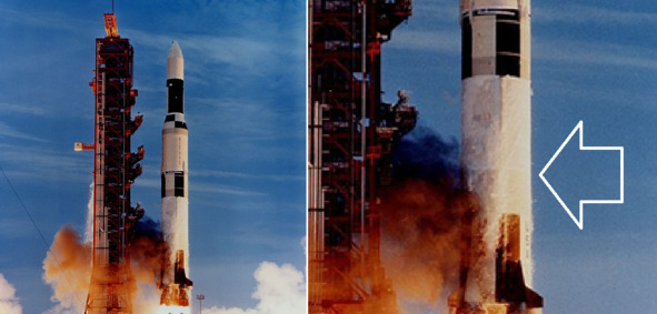 Официальная версия НАСА: «Сатурн-1Б» – американская ракета-носитель, модернизированная версия ракеты-носителя Сатурн-1, имеющая значительно более мощную вторую ступень, S-IVB. Использовалась для испытаний корабля Аполлон, позднее применялась в программах «Скайлэб». Основные характеристики: Количество ступеней 2; Длина – 68 м.; Диаметр 6,6 м.; Стартовая масса 590.000 кг». [1] Официальная версия НАСА с описанием первой ступени: «Первая ступень «Сатурн-1Б». Общие характеристики: Высота 25.5 м.; Диаметр 6.6 м.; Масса 448,648 кг». [2] Обледенение первой ступени, если такая компоновка баков с жидким кислородом, обязательно должно было проявиться на всей поверхности 1 ступени, в виде вертикальных полос. Баки с низкой температурой поверхности были на виду у зрителей, которые видели старт ракеты.