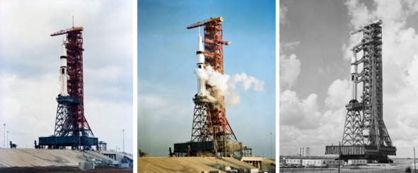 В данной программе, при ее окончании появилось новое чудо американской технологии: «Старт с высокой табуретки». Фотография НАСА, слева: «S73—25696 (15 мая 1973 года) общий вид пусковой площадки B, стартовый комплекс 39, Космический центр Кеннеди, Флорида, показывающий космический аппарат Skylab 2/Saturn 1B во время демонстрационного испытания обратного отсчета (CDDT). Это ракета-носитель для первой пилотируемой миссии „Скайлэб“. Пар, испускаемый из транспортного средства, является сбросом криогенного топлива». [7] Фотография НАСА, в центре: «S73—31697 (20 июля 1973 года) Вид с земли пусковой площадки B, стартовый комплекс 39, Космический центр Кеннеди, Флорида, показ космического аппарата Skylab 3/Saturn 1B во время подготовки к запуску. Ракета-носитель заправляется жидким кислородом во время предпоследнего отсчета криогенной загрузки». [8] Фотография НАСА, справа: «S73—34367 (16 ноябрь 1973) Вид на космический центр Кеннеди, показывающий на близком расстоянии космический корабль Skylab 4 / Saturn 1B на площадке B, стартовый комплекс 39, утро дня запуска». [9] Зрители были удивлены этим зрелищем.