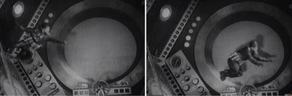 У американцев не было самолетов, на которых можно было поместить макет станции. Проблему надо было как-то решать. И здесь помог опыт режиссёра Стенли Кубрика, возможно, опыт Павла Клушанцева. Не исключено, что американцы воспользовались опытом создания фильма СССР 1935 года «Космический рейс». Это был советский научно-фантастический фильм о покорении космоса, о полете на Луну, созданный киностудией «Мосфильм» в 1935 году. Премьера состоялась 21 января 1936 года. Сценарий фильма был написан при участии и научном консультировании Константина Эдуардовича Циолковского. Режиссер Василий Николаевич Журавлёв. [5] Советские актеры С. П. Комаров, в роли академика Седых, Василий Гапоненко, в роли Андрюши Орлова, Ксения Москаленко, в роли Марины, ассистентки профессора Карина, успешно летали в «невесомости» длительное время. Схема комбинированной съемки была проста как все гениальное: «Для съёмки сцен в невесомости впервые были использованы специальные технические средства, разработанные оператором-постановщиком Александром Гальпериным совместно с будущим крупнейшим конструктором авиадвигателей Александром Микулиным. В декорации кабины космического корабля был построен специальный операторский кран. На специальной площадке крана, которая могла свободно двигаться в горизонтальном и вертикальном направлениях, размещались актёр и киносъемочный аппарат с кинооператором. За счёт свободы движения и наклонов площадки удавалось отснять средние и крупные планы актёров на движущемся фоне. Для съёмки имитации невесомости с вращением персонажа была построена другая установка, в которой подвижный фон вращался относительно неподвижно подвешенного актёра синхронно с камерой, также установленной на поворотной платформе. Трос с резиновым амортизатором, использовавшийся для подвески актёров, окрашивался в цвет фона для маскировки.