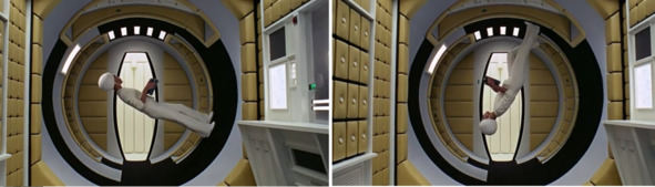 Кларк использовал эту идею для рассказа «Часовой». Обыватель же воспринял эти сцены как некое знание о том, что в невесомости можно ходить и бегать по кругу в цилиндре, в том числе вниз головой. Имеются и кадры «оздоровительного бега» по внутренней стороне колеса. Но необходимо отметить, что Стэнли Кубрик в своем фильме, видимо, имел ввиду несколько другую ситуацию. Космическая станция по сюжету творения Кубрика имела форму колеса, которое вращалось относительно центра. Таким образом, действительно можно создать искусственную гравитацию. Если бы станция «Скайлэб», подобная станции из фильма Кубрика, вращалась с большой скоростью, то в этом случае можно было бы бегать и ходить по стенам станции. Такой же версии придерживался и автор фантастического рассказа «Часовой» Артур Кларк. Эта публикация стала основой для сценария фильма «Одиссея 2001». Фильм был чрезвычайно популярен в США, в Западной Европе, во всем западном Мире. Правда до создателей фильма не дошла простая мысль о том, что официантка с посудой с чайником на подносе при таких вариантах не могла ходить по кругу в маленьком цилиндре. Гравитация действовала только на одной стороне Большого Цилиндра станции в этом фантастическом фильме, при наличии искусственной гравитации. Но обманщиков такие мелочи не смущали. Американцы создали аналогичный симулятор «невесомости», в которой, по их мнению, можно было бегать и ходить по стенкам большого колеса в состоянии невесомости.
