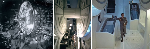 Эта ошибка невежественного английского режиссера, с замашками Бонапарта, сыграет в программе «Скайлэб», с американскими «космонавтами» злую шутку. Фальсификаторы НАСА эти нелепые выдумки невежественного режиссера восприняли всерьез. Они решили создать невесомость в большом цилиндре таким же образом, как это сделал в своем фильме «Одиссея 2001» режиссер Кубрик Стенли. Как можно было объяснить этим недоученным обманщикам, что в невесомости невозможно бегать по внутренним стенкам цилиндра, большого колеса, по кругу? Эта публика, американские пропагандисты и сейчас пребывают в полной уверенности, что такой бег по кругу в невесомости возможен по причине возникновения центробежной силы. Как им объяснить, что человек это не шарик из известного школьного опыта с «мертвой петлей»? Агитаторам США, Кубрику и его соратникам в силу их низкого уровня образования все это объяснить было невозможно. Поэтому эти невежественные «специалисты» для демонстрации космоса показали доверчивым обывателям бег в колесе. Ниже, слева колесо, с помощью которого в фильме снимали бег по кругу внутри цилиндра. В этой конструкции по задумке авторов находилась сама станция. Колесо вращалось в «космосе» и создавало тем самым искусственную гравитацию. В центре и справа кадры интерьера «космической» станции. Человек в космосе ходит по внутренней стороне цилиндра. Цилиндр, якобы вращается по сюжету фильма. Идею создания искусственной гравитации при вращении высказал Циолковский.