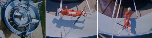 Но проблема ситуации со станцией «Скайлэб» была иная. Эта станция не вращалась. Там, по мифологии НАСА, не пытались создать искусственную гравитацию. Фильм НАСА «Space Station Centrifuge Gravity Simulation» продемонстрировал тренажер, созданный под влиянием фильма «Одиссей-2001». [6] В этой установке, «космонавт» мог побегать по кругу, потом немного полетать, потом снова побегать. Дело было за малым, как сделать систему подвесов невидимой для зрения. И такие нити из карбона имелись в распоряжении обманщиков. на большом расстоянии от зрителя, при размытых кадрах они были невидимыми. Кадры режиссера Кубрика так понравились американцам, что они потом в программе «Скайлэб» продемонстрировали то, что в реальной невесомости быть не может: бег по внутренней стороне цилиндра, по стенкам «космической станции», с переходом в плавании в состоянии «невесомости». Так была решена проблема демонстрации состояния невесомости в большом цилиндре «станции». Собственно, на этом эпизоде демонстрации «бега в невесомости», обманщики и попались, о чем будет сказано подробно, позднее. НАСА не скрыло от общественности наличие у обманщиков копии станции, где проходили тренировки. Это были абсолютно точные копии станции «Скайлэб», которую потом обманщики показали в американском «космосе». Такие отсеки можно было размещать в самолетах нулевой гравитации НАСА и там снимать сцены в невесомости. Ниже представлены фотографии с демонстрацией моментов тренировки «космонавтов» шоу «Скайлэб-2».