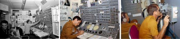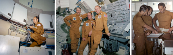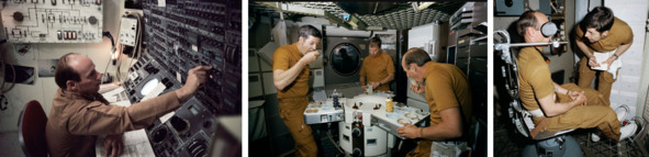 Фотография НАСА слева: «S73—16765 (1 февраля 1973 г.). Астронавт Чарльз Конрад-младший работает с панелями управления тренера „Орбитальная мастерская Скайлэб“ во время тренировки Скайлэб в Космическом центре им. Джонсона». [7] Фотография НАСА, в центре: «S73—20236 (1 марта 1973 г.). Три члена основного экипажа первой пилотируемой миссии Скайлэб обедают на специально приготовленной космической пище Скайлэба в каюте комнаты экипажа инструктора Орбитальной мастерской Скайлэб (OWS) во время тренировки Скайлэб в космическом центре Джонсона». [8] Фотография НАСА, справа: «S73—20678 (1 марта 1973 г.). Астронавт Чарльз Конрад-младший, командир первой пилотируемой миссии Скайлэб, проверяет Вестибулярную функцию человека, Эксперимент M131, во время тренировки Скайлэб в Космическом Центре Джонсона». [9] Снимки являются копиями кадров «прямой трансляции».