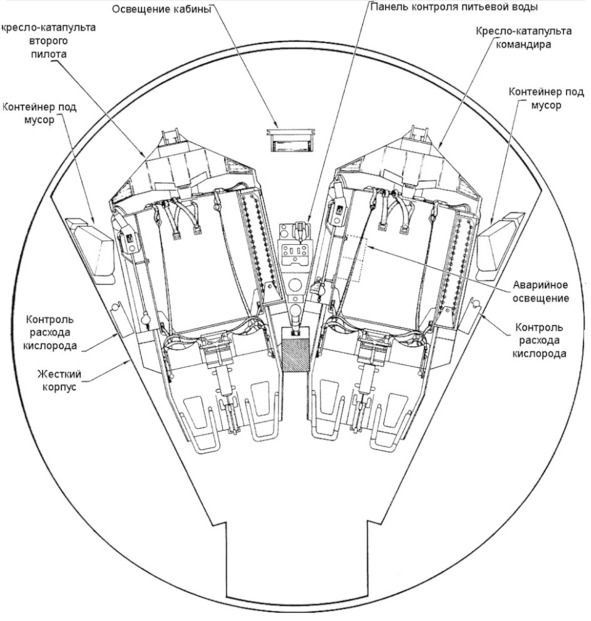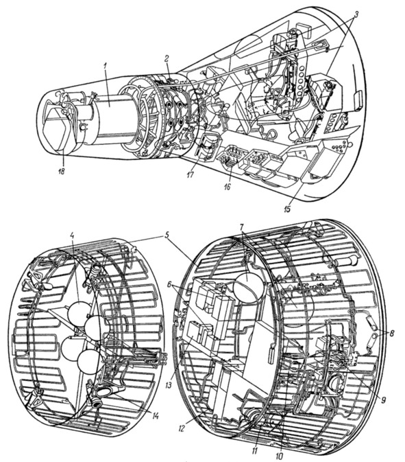 Конструкторы, которые создавали это очередное технологическое «чудо» нарисовали рисунок [2], на котором в разрезе было показано общее устройство этого «космического» аппарата. Обращает внимание расположение двигателей торможения на тепловом экране. Этих объектов на реальных капсулах никто не увидит. Изменилось расположение двери люка. Теперь его край был рядом с тепловым экраном. Там же располагалась резиновая прокладка, обеспечивающая герметичность.