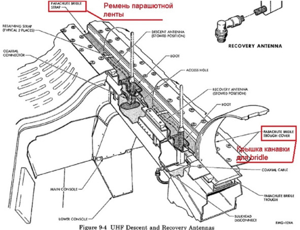 Там, по мифологии НАСА, максимальный нагрев конструкции. Подпись к фотографии НАСА: «S65—13244 (6 января 1965 г.) – Основной экипаж Джемини-Титан 3, астронавты Вирджил И. Гриссом (слева) и Джон У. Янг, показаны в космическом корабле Джемини-3 во время испытания связи». [4] Красными прямоугольниками отмечены места, где отсутствуют винты, и места, где расположены панели с переключателями. Между двумя отсеками находится желоб, в который укладывалась стропа парашюта. Тепловой защиты этого желоба в виде панели с абляционным покрытием не существовало. Достаточно вспомнить, что согласно американской мифологии, температура в нижней части поверхности аппарата, на боковой поверхности, достигала 1300 градусов. Этого нагрева за минуту будет достаточно для повреждения брезентовой ленты, стропы парашюта.