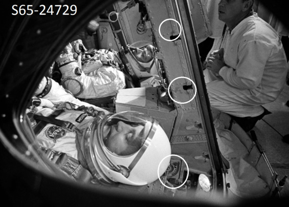 Подпись к фотографии НАСА: «S65—13242 (6 января 1965 г.) – астронавт Джон У. Янг входит в космический корабль Gemini-3 для проверки связи в районе запуска». [3] На кадре наглядно продемонстрирована плохая окраска поверхности внутри кабины. Часть краски осыпалась. На увеличенных фрагментах указанного снимка хорошо видно, что во многих местах верхнего покрытия в виде пластинок, не прикручены винтами. Тоненькие шайбы под головкой винтов не являются гроверами. Это значит, что при вибрации во время реального космического полета такая конструкция рассыплется, как карточный домик. Винты будут вырваны из пластин, из отверстий на металлическом каркасе. Ниже представлены фрагменты снимков НАСА.