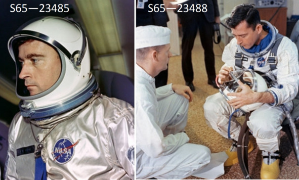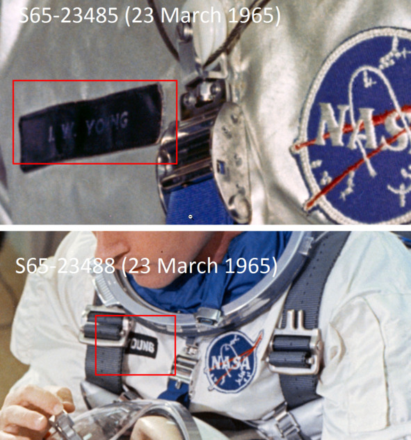 Снимок слева, подпись: «S65—24721 (23 March 1965)». «Космонавт» США на снимке одет в белый костюм. Гермошлем в верхней части не имеет полос. Фотография справа: «S65—23489 (23 March 1965) Астронавт В. Гриссом в КК „Джемини3“ перед запуском». «Космонавт» на этой фотографии одет в серебристый костюм. Гермошлем изменил внешний вид. Если про цвет костюма можно спорить, что это «цветовая температура» изменена, то с шевронами все плохо. Изменение вида шеврона «Гриссом» на первой фотографии, очевидно.