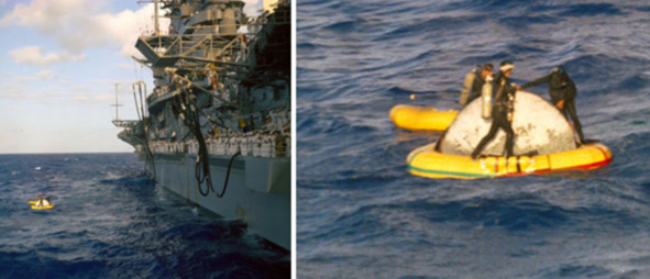 Фотография НАСА, подпись: «S65—18528 (23 марта 1965 года) «USS Intrepid» подходит к космическому кораблю «Gemini-3». [9] Виден зеркальный «тепловой экран».