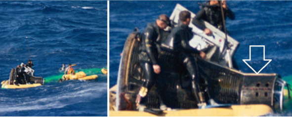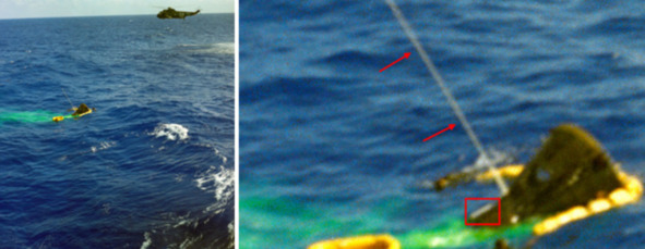 Фотография НАСА и выделенный, увеличенный фрагмент. Подпись под фотографией: «S65—18645 (23 марта 1965 года). Показано, что пловцы военно-морского флота прикрепляют плавучий воротник к космическому кораблю Gemini-Titan 3». [10]