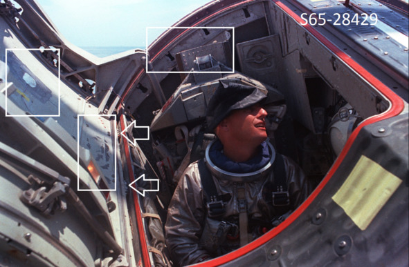 Необходимо обратить внимание на пульт с переключателями за скобами, через которые очень сложно использовать указанные тумблеры. Снимок НАСА показывает нелепые конструкторские решения: закрытие решетками панели с переключателями на боковой части кабины, слабые петельки люка.