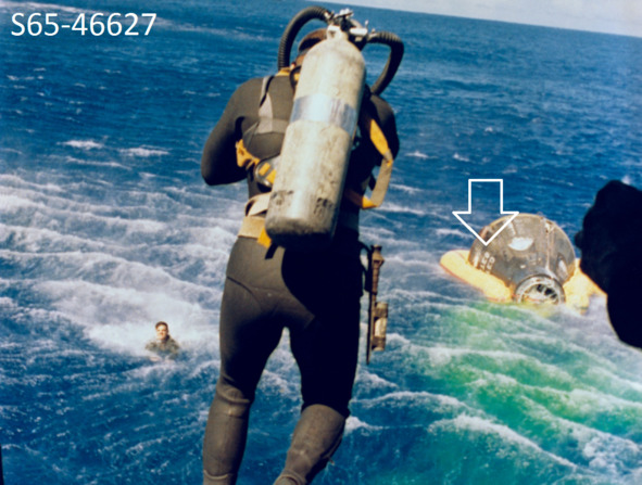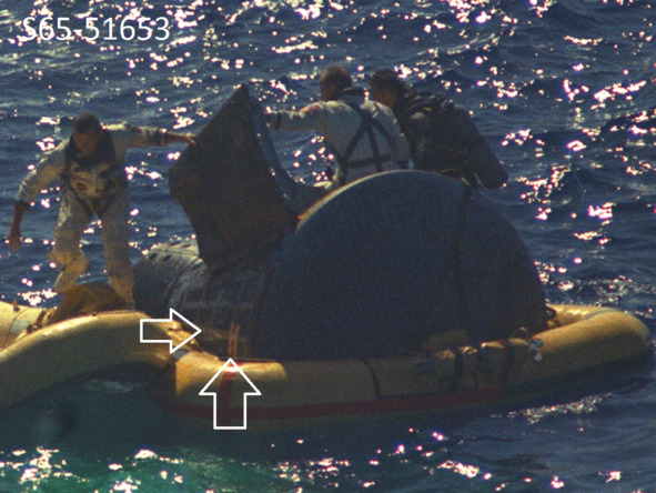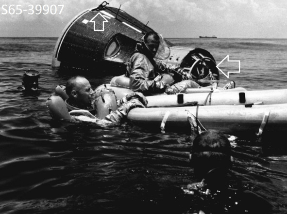 Фотография НАСА, подпись: «S65—39907 (21 июля 1965 г.) Главный экипаж космического полета „Gemini-Titan 5“ (GT-5), астронавты Чарльз Конрад-младший (в воде) и Л. Гордон Купер-младший (на плоту) практикуют методы выживания после успешный выход с их космического корабля „Gemini Static Article-5“ в Мексиканском заливе». [3] Здесь же продемонстрировано, что носовая негерметичная часть этой кастрюли погружена в воду. Американские мистификаторы сильно рисковали.