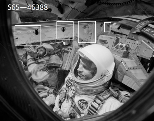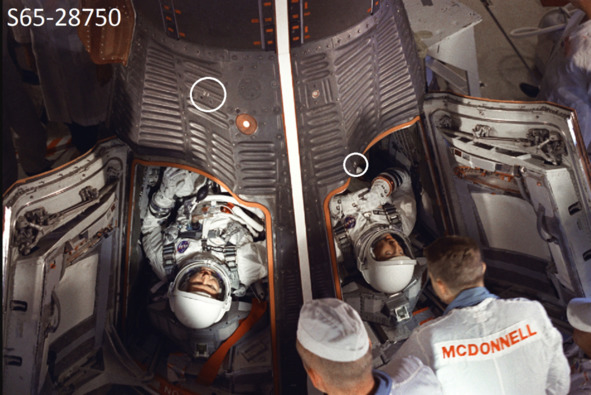 Фотография НАСА, подпись: «S65—46388 (21 августа 1965 г.) Астронавты Л. Гордон Купер-младший (на переднем плане) и Чарльз Конрад-младший изображены на изображениях космического корабля Джемини-5 перед тем, как люки были закрыты». [5] На этом изображении хорошо видно, что «космонавтам» тяжело будет достать рукой до переключателей на потолке, в крайнем ряду панели тумблеров.