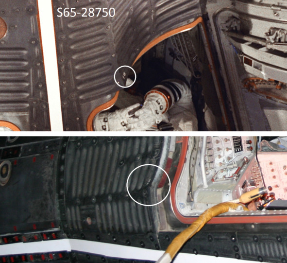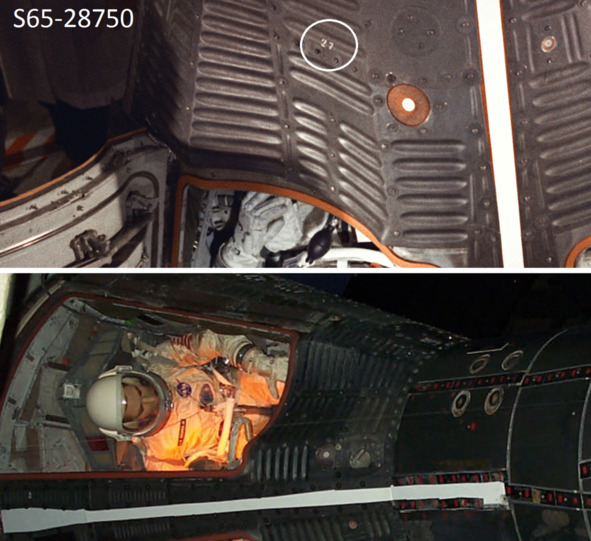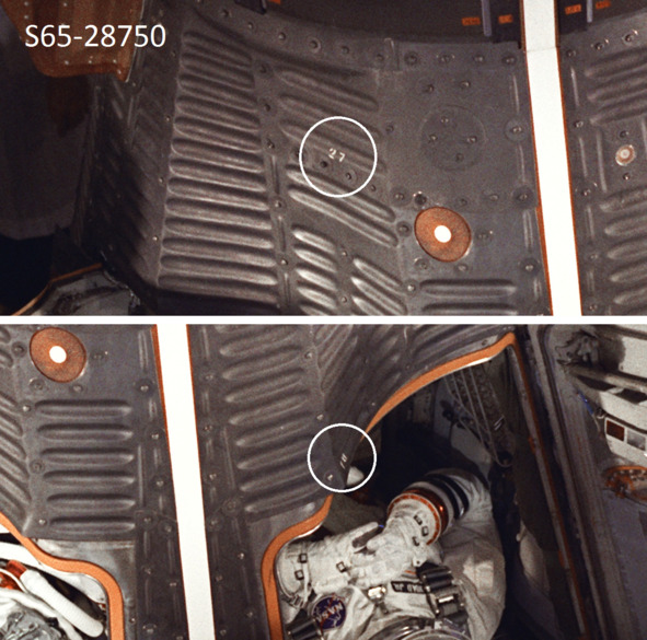 Фотография НАСА, подпись: «S65—28750 (21 августа 1965 г.) – Астронавты Л. Гордон Купер-младший (слева) и Чарльз Конрад-младший видны в космическом корабле „Близнецы-5“ в белой комнате на Площадке 19». [4] Указанные цифры «27», «10», которые видны на увеличенных фрагментах снимка, хорошо видны. Они не могли обгореть. Сама капсула «Джемини», как известно не обгорала совсем. На боковой поверхности этого аппарата после приводнения никогда не было следов нагара и копоти. Поэтому, если перед стартом такие цифры были, то они должны сохраниться на этих же местах, на капсуле после окончания миссии. Белыми окружностями на кадрах, расположенных ниже, отмечены указанные места нахождения белых меток. Они потребуются для сравнения снимков, сделанных на старте и после окончания миссии «Джемини-5».
