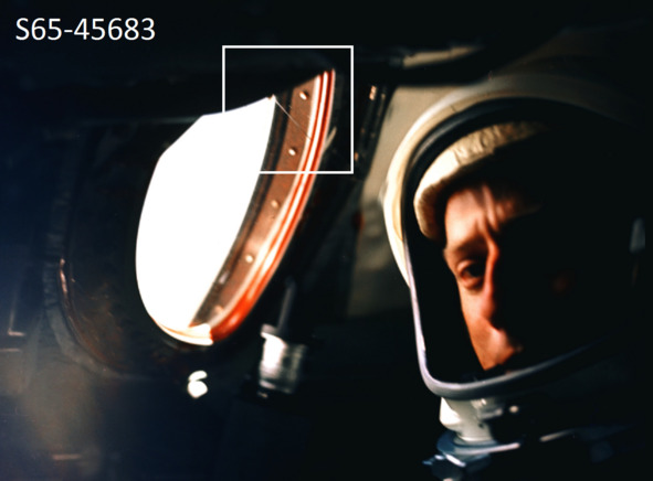 Фотография НАСА, надпись: «S65—45683 (21—29 августа 1965 г.) Астронавт Чарльз Конрад-младший в космическом корабле Близнецы-5 на орбите Земли. Астронавт Л. Гордон Купер-младший сделал эту фотографию». [6] Разве можно себе представить ситуацию, когда, например, советского космонавта отправляют в реальный космос с иллюминатором в космическом аппарате, на котором стекло треснуло, а герметичность иллюминатора нарушена? Это в принципе невозможно!