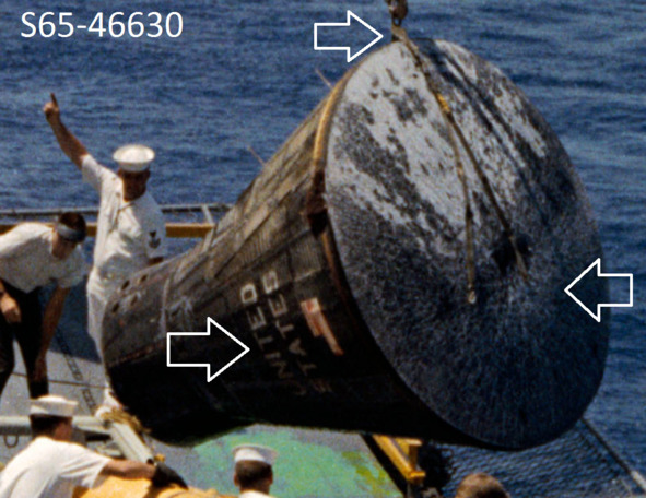 Следующая фотография НАСА 46630 у защитников НАСА всегда вызывала оптимистические настроения по поводу наличия следов аэродинамического нагрева на тепловом экране «космического» аппарата «Джемини 5». В указанном месте наблюдаются темные места, которые ревностные поклонники американских «достижений» принимали за следы аэродинамического нагрева. В действительности, темные места на нижней части аппарата это влажная поверхность.