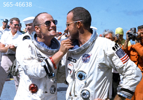 Фотография НАСА, подпись: «S65—51653 (29 августа 1965 г.) – Астронавты Л. Гордон Купер-младший и Чарльз Конрад-младший выходят из своего космического корабля после приводнения космического корабля Джемини-5». [7] Фотография НАСА с фрагментом изображения «космической» капсулы, обращенной к фотографу тепловым экраном, особенно наглядно демонстрирует отсутствие следов теплового воздействия.