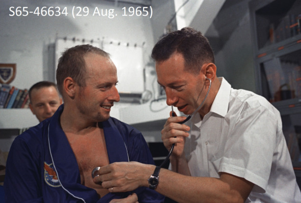 Фотография НАСА, подпись: «S65—51445 (29 августа 1965 г.) – Доктор Луи П. Балленбергер, капитан USN, начинает предварительное медицинское обследование астронавта Л. Гордона Купера-младшего, пилота-командира Близнецов-5». [11] Щетина растет примерно одинаково. Если у одного она образовалась, то и другого она тоже должна быть. Никаких упоминаний о бритье в этом шоу НАСА не упоминается. На фотографии 46638 «космонавт» Конрад по этому поводу явно шутил, мол, смотри, Купер, какая борода у тебя выросла!