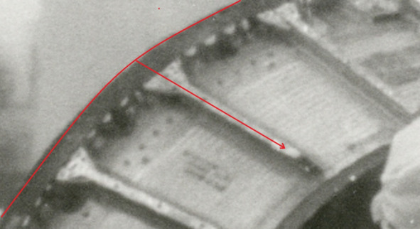 Направление распространения тепла от зоны максимального нагрева в кабину «космонавта» США показывает красная стрелка. Если верить американским цифрам, то боковая поверхность конструкции при аэродинамическом нагреве доходила до 700 градусов Цельсия. Нижняя часть нагревалась до температуры 1300 градусов Цельсия, по сведениям сказочников НАСА. Тепло в обход теплоизоляционного материала будет проникать по ребрам на металлическую стенку внутренней обшивки и нагревать ее до указанных температур, что неизбежно привело бы к расплавлению пластиковых частей шлангов, панели переключателей и прочее. Гибель человека, который будет находиться в «космической» кастрюли «Меркурий», практически неизбежна. На увеличенном фрагменте капсулы НАСА показано направление распространения тепла по ребрам из зоны теплового экрана. Температура в Фаренгейтах по данным специалистов НАСА была продемонстрирована на схеме: «Температурный профиль (по Фаренгейту) аппарата Меркурий из отчета МА-6». Перевод градусов по Фаренгейту в градусы по Цельсию: 3000° F=1648.89°; 1300° F=704.44°; 700F=371.11°.