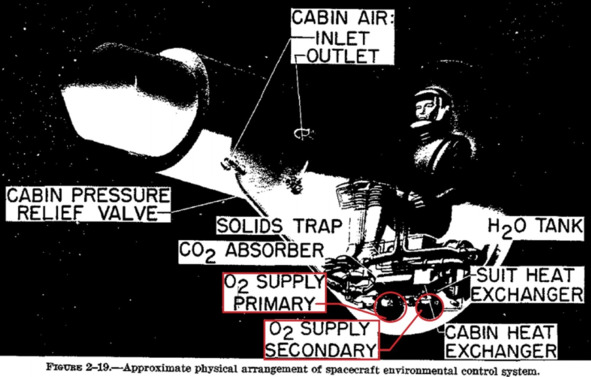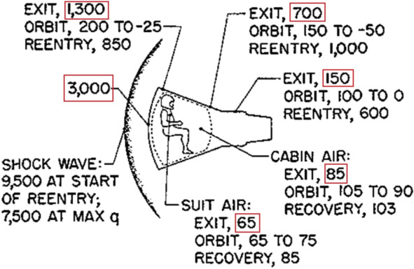 Но формула Оберта дает цифры температуры на поверхности теплового экрана от 5000°С до 8000°С, в зависимости от угла входа в атмосферу. На верхней части поверхности капсулы, значение температуры нагревания указано 150° F=65.56°С. Эта величина вызывает большие подозрения. Температура внутри кабина по данным НАСА не превышает значения 85° F=29.44°С. Температура воздуха внутри «скафандра» американского космического актера не превышает значения 6585° F=18.33°С. Но даже такие величины нагревания поверхности капсулы, а значит, поверхности металлических ребер каркаса должны были привести к гибели пилота за то время, когда такие температуры аэродинамического нагрева, по версии НАСА, проявлялись при спуске капсулы из космоса в атмосферу. Между пластинами и ребрами не было никакой теплоизоляции. Нагрев поверхности вызывает нагрев ребер каркаса и металлических листов внутри кабины. Нагревание поверхности кабины до 700°С-500°С – это гарантированная смерть «космонавта» за пару минут. К этому надо добавить еще одну особенность конструкции.