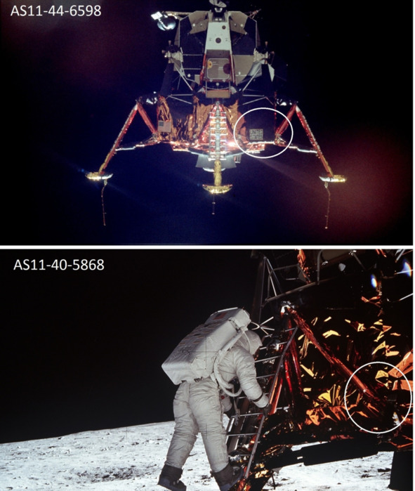 Аномалии «лунных фотографий проявляются при сравнении. На увеличенном фрагменте фотографии НАСА 5866, плохо видимой стала табличка с посланием зеленым человечкам от Президента США Никсона. На табличке было написано, американцы пришли на Луну с миром. На фотографиях НАСА 5898 и 5899 [33], [34] в зеркальной поверхности таблички не видно отражения «космонавта» в белом костюме. Не видно и отражение «космонавта» на полузеркальной поверхности перекладин и на поверхности серебристой фольги. По всей видимости, фотограф находился в подъемном механизме и снимал это место лестницы для истории, с высоты более 2 метров с некоторого расстояния от главной декорации шоу «А-11».