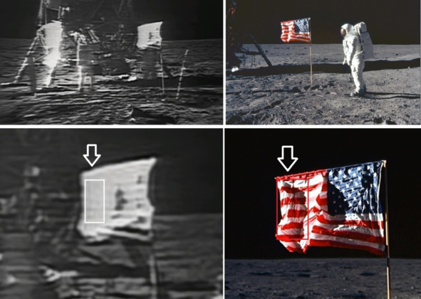 Все познается в сравнении. Если рассмотреть последовательный спуск «космонавта» с «ЛМ» по лестнице, то аномальное появление блика становится очевидным. Сначала этот блик виден, потом он исчезает. Ниже фотографии НАСА, справа налево: AS11-40-5862; AS11-40-5863; AS11-40-5866. [29], [30], [31] Направления съемки практически неизменно, с небольшими переходами фотографа вправо от лестницы. Но на фотографии 5862 блик от яркого света на правой стороне «ЛМ» виден, а на других фотографиях этот след от направленного освещения отсутствует. На следующих фотографиях этот след от освещения тоже не наблюдается. Предположительно, это была ошибка осветителей, однозначно, блик не является дефектом снимка.