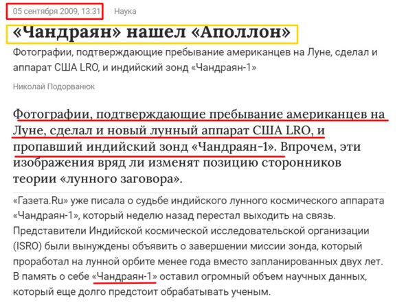 Только вот, как уже заметили внимательные читатели, речь в нём идёт о первом зонде «Чандраян» и та статья вышла в сентябре 2009 года. Сейчас, в 2021—2022 годах, на лунной орбите работает уже «Чандраян-2» и он снова (вот ведь удивительные дела) подтверждает высадки! Разумеется, память человеческая в эпоху интернета и густого потока информации короткая: о Ч-1 и его замечательных подтверждениях все давным-давно забыли. И вот этот же замшелый фокус снова извлекается факирами из потёртого от времени и трения цилиндра – и нам снова его демонстрируют всё, как будто бы в первый раз!». [7] И это точное понимание ситуации. Указанная публикация была напечатана до «полета» АМС «Чандраян-3». После него поднялась такая же лживая рекламная компания фальшивых «достижений» США и Индии. Снова защитники НАСА начали публиковать лживые статьи, что последняя миссии индийского аппарата все доказало. Больше того, ретивые американские пропагандисты все переврали и сообщили, что АМС «Чандраян-1», давно подтвердила реальность «лунных» полетов шоу «Аполлон»:
